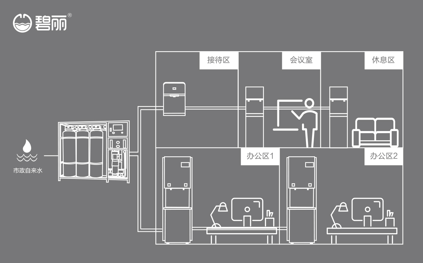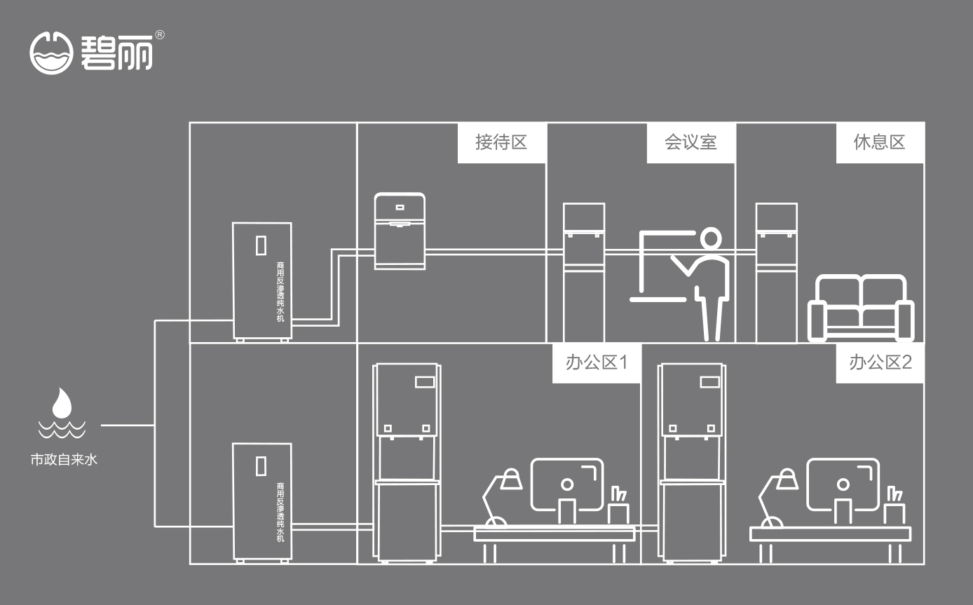 碧麗商用反滲透純水機(jī)將自來水集中處理后,把優(yōu)質(zhì)的純凈水通過專用的供水管道輸送到各飲水點;