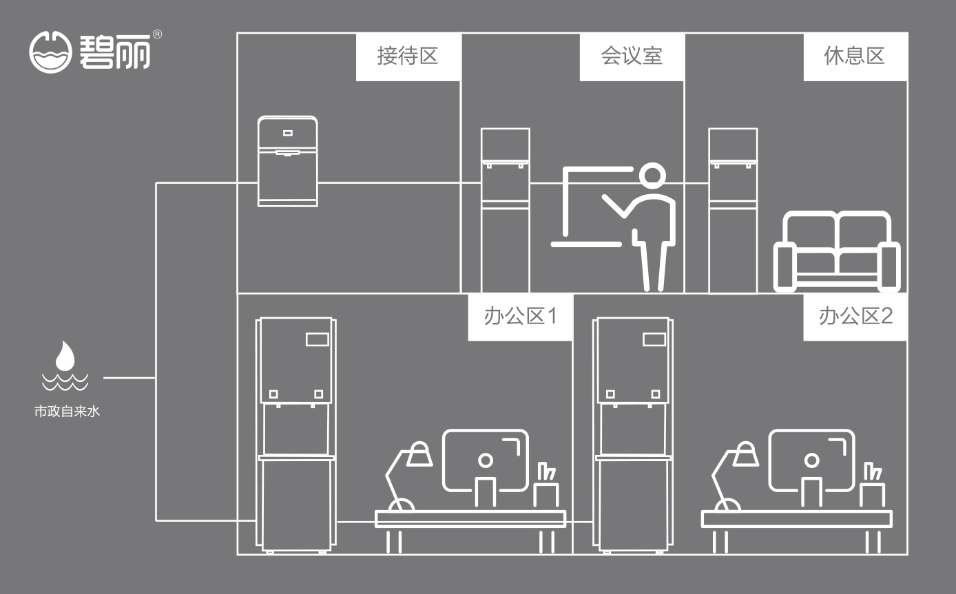 售后維護(hù)、更換濾芯方便,解決因場地限制無法滿足同時供應(yīng)多個飲水點的難題;